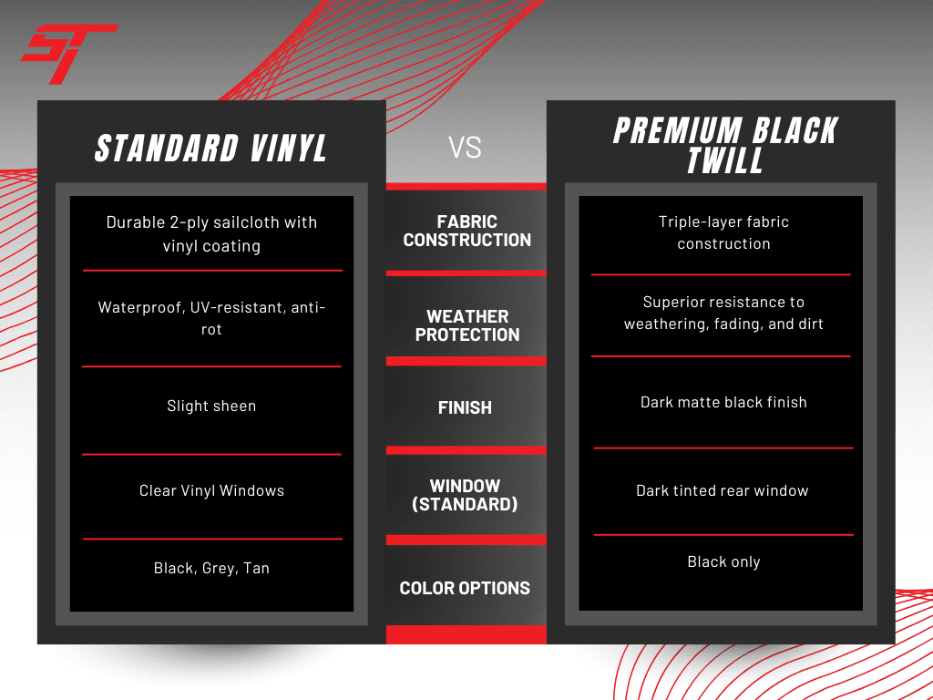 When comparing soft top fabric options, both Premium Black Twill and Standard Vinyl are built to protect your truck and handle everyday use. The difference comes down to insulation, finish, and overall feel.