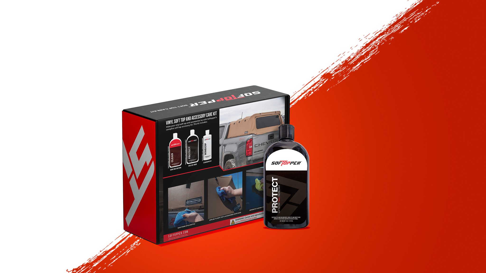 The Softopper Soft Top Care Kit offers a comprehensive solution for maintaining your Softopper canopy and vinyl windows. This all-in-one kit includes primary vinyl fabric and vinyl window care products, each formulated to provide exceptional protection and longevity. The protectant system ensures your soft top and accessories remain in pristine condition, offering total care and peace of mind.
